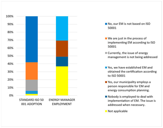 The majority of the respondents (58%) stated that they developed their own EM, which is not based on the ISO 50001 standard. In total, 22% of the respondents stated that energy management according to ISO 50001 is just being implemented. A total of 14% of the respondents (i.e., seven municipalities) or municipal districts did not address the issue of energy management at all. Only 4% reported that they had implemented energy management according to ISO 50001 and have been certified by an independent certification body. One municipality did not answer this question.