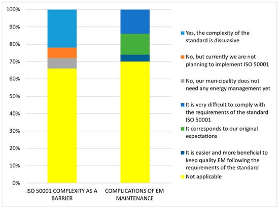 According to the replies to previous questions, only 4% of the respondents implemented the ISO 50001 standard and 22% of the respondents were just in the process of implementation. That means that most respondents did not have any direct experience with ISO 50001. Therefore, 66% of the respondents were not able to answer the question if the complexity of ISO 50001 is the barrier to implementation. A total of 22% of the respondents found the standard dissuasive due to its complexity. In total, 6% of the potential users did not want to implement energy management based on ISO 50001, regardless of its possible complexity. The remaining 6% of the municipalities did not address the issue of energy management whatsoever.
