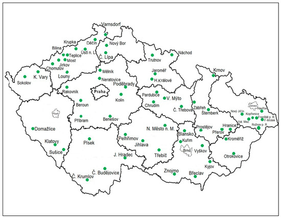 In total, 124 cities were contacted, and 62 completed questionnaires were returned, which makes a return rate of 50.0%. The cooperated cities are highlighted in the map of the Czech Republic (Figure 4). All used questions are listed in Appendix A.