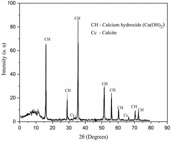 The commercially available hydrated lime was adopted for this study. The presence of Ca(OH)2 in the material was confirmed by the results of XRD analysis. The peaks of the hydrated calcium hydroxide were observed in the XRD analysis of lime, as shown in Figure 1.
