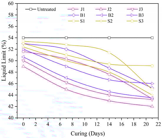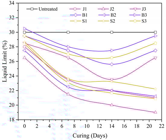 The soil was treated with three urease enzyme solutions, and the plasticity characteristics were determined at different curing periods, as depicted in Figure 3. Initially, the liquid limit of soil 1 was recorded as 30%. A reduction in the liquid limit was observed upon treatment with the enzyme solutions, with the highest reduction achieved for the J2-treated soil. Specifically, when the soil was treated with the jack bean urease solution (J1 and J2), the liquid limit decreased to 21% and 19% at the 21-day curing period, respectively. However, the liquid limit increased when the soil was treated with the J3 solution, attributed to the absence of non-fat milk powder in the enzyme solution.
