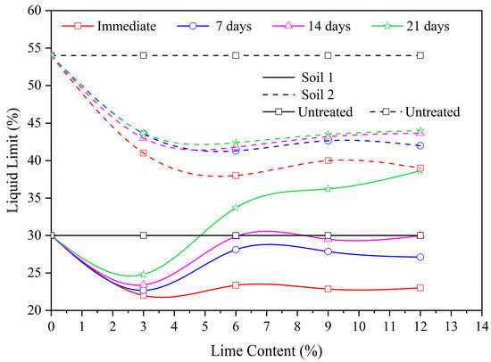 The plasticity of the soil is predominantly linked to the liquid limit. The liquid limit for untreated and lime-treated soils was determined at different curing periods, as shown in Figure 5. In the case of soil 1, adding lime up to 3% resulted in a reduction in the liquid limit, followed by a subsequent 40% increase at 6% lime content. Beyond this point, the liquid limit remained constant, with up to 12% lime content. This decline in liquid limit is attributed to the reduction in diffuse double layer bounded on the clay particles, induced by the release of Ca+ ions from lime into the soil water [39]. This phenomenon elevates ionic concentration, thereby decreasing the diffuse double layer and subsequently reducing the soil’s water-holding capacity. The increased liquid limit values at higher lime contents and long curing period of 21 days may indicate the formation of an increased quantity of calcium silicate hydrate (CSH) gel, influenced by the presence of silica in the red earth [40]. Notably, no significant variations in liquid limit were observed beyond 6% lime content.