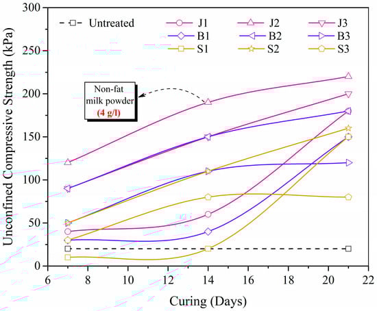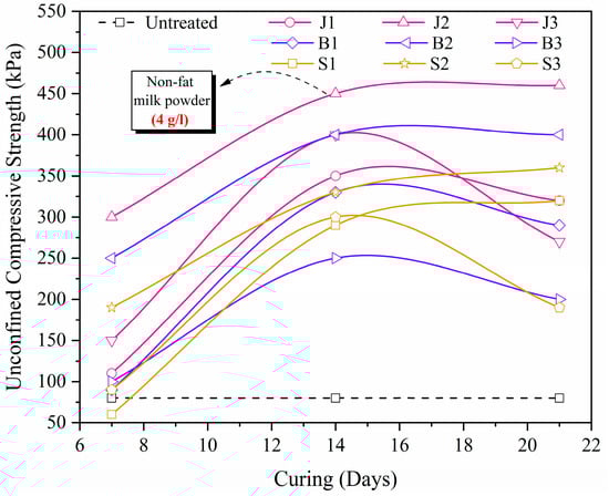 UCS tests were conducted on soil samples treated with enzymes following the guidelines of ASTM D2166/D2166M-16 [36]. These tests aimed to provide insights into the impact of Enzyme Solutions on the strength properties of soils. Figure 6 and Figure 7 present the UCS results for soil 1 and 2 samples, respectively, treated with enzyme solutions and cured for 7, 14, and 21 days. The observations revealed that the UCS values of the soil samples reached their maximum levels when treated with J2 and cured for 21 days. Non-fat milk powder in J2 played a key role as the primary strength enhancer, which improved the strength to 465 kPa by creating nucleation sites in the soil, thereby improving the precipitation of CaCO3. However, non-fat milk powder was also present in J3, where the strength gain was less than that of J2 due to the lower amount of urease enzyme used in J3 (0.85 g/L compared to J2) [41].