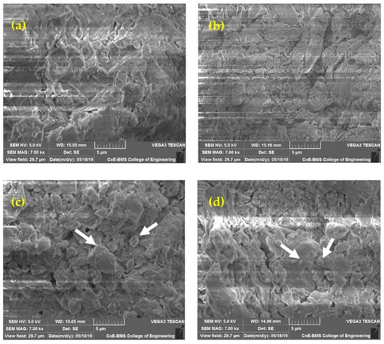 SEM images of (a) raw black cotton soil, (b) 21-day cured EICP-treated black cotton soil, (c) raw red soil, and (d) 21-day cured EICP-treated red soil.