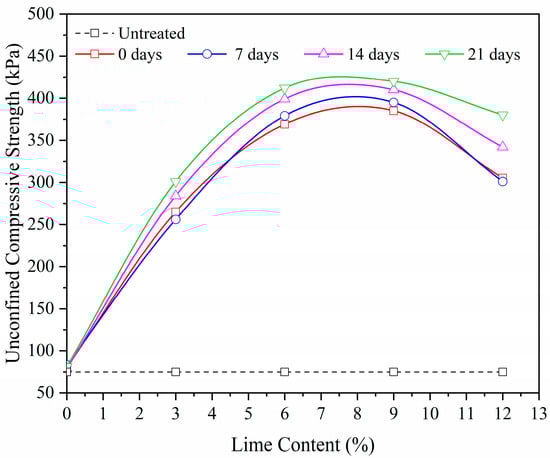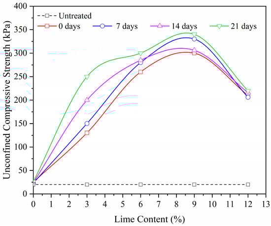 The UCS of soils 1 and 2 treated with lime at 3, 6, 9, and 12% dosages was determined. The initial strength of soil 1 was 80 kPa, and it was increased to 265 kPa immediately after adding 3% lime. The highest strength was observed as 385 kPa at 9% dosage, as depicted in Figure 11. The ionic concentration increased due to the transfer of Ca+ ions from lime to the soil surface resulted in the thinning of diffuse double layer, followed by the reduction of the liquid limit. This phenomenon might be responsible for the strength improvement at zero-day curing. Gradually, the strength was increased with the curing period. The higher value of 420 kPa was achieved at 9% dosage when cured for 21 days. This improvement is attributed to the pozzolanic activity that forms the cementitious gel when calcium hydroxide reacts with the silica and alumina present in the soil. The strength in soil 1 was improved by 425% with the lime addition of 9%. However, the decline in the strength was shown after 9% lime. The particles of hydrated lime are finer and do not possess any considerable cohesion and friction. In higher quantities, lime can act as a lubricant that reduces the bonding between the particles [43]. Comparing this technique with EICP, soil 1 achieved relatively better strength with the treatment of urease solution. It can be noted that kaolinitic soil can be treated best with the EICP technique rather than lime.