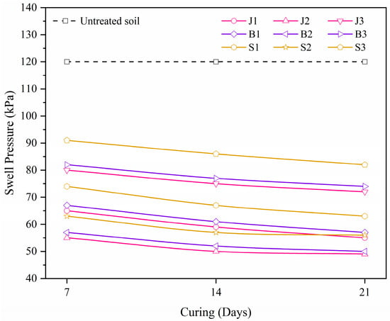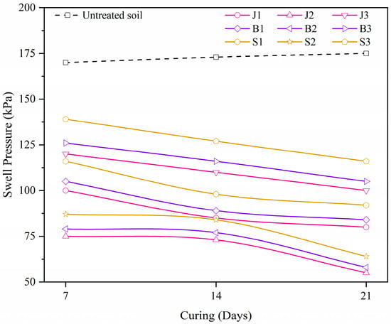 Untreated soils and soils injected with enzyme solutions were tested for their swell behavior by performing a soil swell test (using an oedometer) as per ASTM D4546-21 [37]. Figure 13 and Figure 14 depict the swell pressure of controlled and EICP-treated samples obtained from the present study. It was found that with the treatment of enzyme solutions and the specimen aging effect, the swell pressure values were dropped. The effectiveness of J2 is notable in both soils, demonstrating superior results. The initial swell pressure for untreated soil 1 was 119.83 kPa, and for untreated soil 2, it was 169.1 kPa. After enzyme treatment, the swell pressure significantly decreased to 37.68 kPa for soil 1 and 47.2 kPa for soil 2, particularly when treated with J2 and cured for 21 days. Similarly, bio-enhancer- and soya bean-amended soil samples also reduced the swell pressure. The order of reduction in swell pressure was J2 < B2 < S2, which strongly agreed with the previous studies [45]. The management of swell characteristics in expansive soils can be obtained through the precipitation of CaCO3 [46]. This enhancement in swell characteristics may result from the adhesion of soil grains to each other following CaCO3 precipitation. Moreover, the EICP technique, known for its effectiveness in improving UCS values, indicates that externally applied loads become less effective on the soil due to CaCO3 precipitates. This same mechanism is attributed to the reduction in swell pressure in the soil, where capillary water appears to detach the soil grains [41].