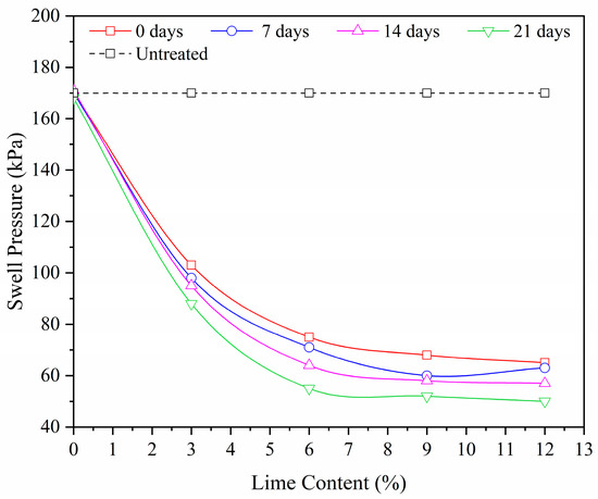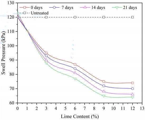 Using an oedometer, the change in the soil volume was determined to study the swell pressure. It is the pressure at which the soil’s volume can be restrained from swelling. The swell pressure of the untreated soil 1 was observed as 119.83 kPa, and it had reduced gradually to 88, 76, 65, and 64 kPa when lime content of 3, 6, 9, and 12% was added to the soil 1 after curing for 21 days as shown in Figure 15. This decline in the swell pressure represents its resistance to the volume change when soil gets in contact with water. As shown in Figure 15, the swell pressure reduced its value until the soil was added with lime up to 9%. The soil’s swell pressure remained the same, with up to 12% lime content. The decreased swell pressure is associated with the reduced diffuse double layer arising from the increased ionic concentration at higher lime content. Moreover, the soil mitigated more swell with an increased curing period. This phenomenon can be attributed to the enhancement of soil bonding through the pozzolanic reaction, which develops gradually over extended periods.