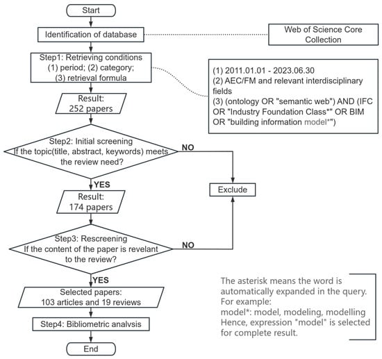 Web of Science Core Collection, which is widely used in literature reviews in the AEC/FM field and contains the most important and influential journals in the world, is chosen as the database for paper retrieval for high-quality papers [50,51]. To ensure a comprehensive review of IFCOI, the selection of papers is not limited to the AEC/FM field, it also considers relevant interdisciplinary fields, such as computer science. These research fields determine the corresponding categories setting of WOS in Step 1 (as shown in Figure 1). To have no omissions in paper retrieval, ‘BIM’ and ‘Semantic Web’ are also added to the search string apart from ‘IFC’ and ‘ontology’. We selected the relevant literature in recent decades to study the latest research progress of IFCOI, and the corresponding time range was set from 1 January 2011 to 30 June 2023. Keywords included, but were not limited to, ‘BIM’, ‘IFC’, ‘ontology’, and ‘semantic web’. Boolean operators were used to combine multiple keywords, and the corresponding search string is shown in Figure 1.