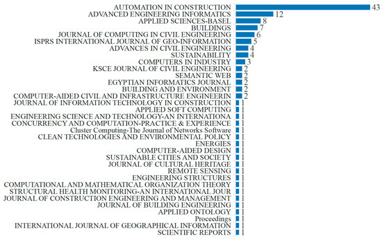 This research used NoteExpress v3.7.0 [52] to analyze the journal distribution of selected papers, and the result is shown in Figure 2, with Automation in Construction [53] as the top journal. The fields of these papers mainly lie in AEC/FM, computer science, and geographic information science. This result aligns with the objective of this review.