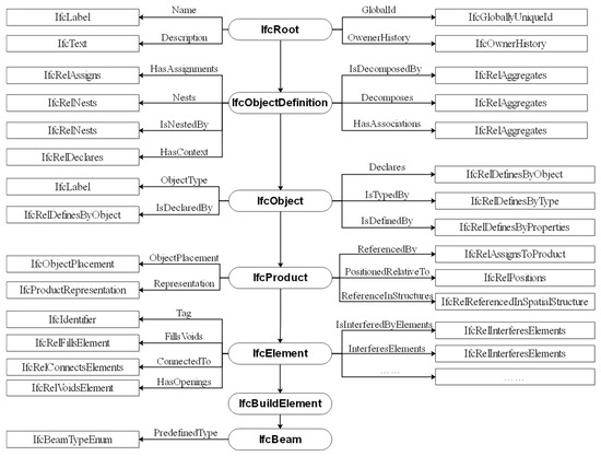 The IFC standard defines, in detail, the representation of basic information, geometric information, and attribute information. In the IFC data schema, each entity describes its own information through attributes. For example, Figure 4 shows the inheritance relationships of IfcBeam. IfcElement in the figure has 13 attributes, some of which we omitted. There are six layers of inheritance from IfcRoot to IfcBeam. The attributes of entities in IFC files are mainly obtained through inheritance relationships. In addition to its own attribute, IfcBeam has all attributes derived from the parent entity through inheritance. Therefore, through the IFC data schema, the required BIM data can be quickly acquired.