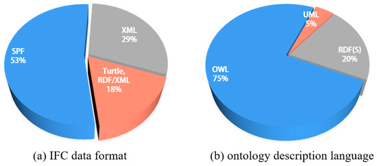 Pie charts of data and model dimension: (a) statistical chart in IFC data format; (b) statistical chart in ontology description languages.