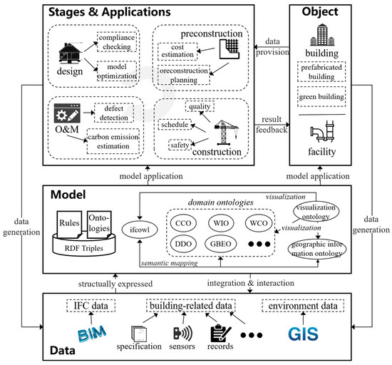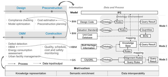 Nevertheless, there are still some challenges in domain information representation and heterogeneous data fusion in BIM-incompatible environments, where professional boundaries in vendor barriers limit the interoperability of BIM data. IFC provides a rich yet redundant and ambiguous schema for interoperability and the same information may have multiple data structures in the IFC data schema, which is caused by the lack of semantic clarity in mapping entities and relationships [11]. Due to data heterogeneity, information loss, omission, error, or even inaccessibility may occur in the interaction between BIM and other related data, such as cost data, professional analysis data, monitoring data, and Geographic Information System (GIS) data. Even if IFC is committed to the integration of data from different users throughout the lifecycle, additional technical means are still needed to address data heterogeneity.