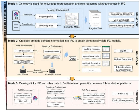Given the capacity of ontology and the challenges faced by IFC, IFCOI is dedicated to addressing data heterogeneity issues. Integrating IFC data with ontologies can be applied throughout the lifecycle, ranging from design [24] and preconstruction [25] to construction [26], operation, and maintenance [27]. Prevailing research shows that IFCOI has been used in compliance checking [28], facility management [29], cost estimation [30], and so on. With the explicit and normalized representation capability, ontology can be combined with IFC to eliminate interoperability differences across domains and phases and thus facilitate whole building lifecycle management.