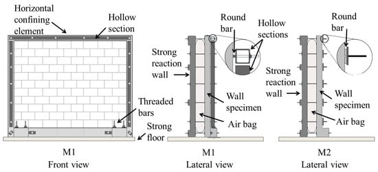 Incremental out-of-plane uniform loads were applied to the walls until failure. The wall test setup is presented in Figure 1. Two airbags of 3.0 m × 1.2 m (length × height) were used to apply these loads. These bags were placed between the wall and a strong reaction wall. Steel threaded bars were placed in the vertical and top confining elements to join the wall to the reaction wall. Confining elements were restricted using simple supports to prevent horizontal out-of-plane displacements. In wall M1, these supports consisted of hollow steel sections with a steel round bar attached to it. In wall M2, these supports consisted of individual steel plates with a steel round bar attached to it. The bottom end of the vertical confining elements was attached to the laboratory’s strong floor to create a fixed support. Pressure transducers were used to measure air bag pressure. Out-of-plane loads reported in this work correspond to equivalent loads. These loads were calculated using the ratio between the contact area of the airbags and the total wall area [22]. Linear potentiometers LP1 and LP2 were used to measure out-of-plane horizontal displacements (Figure 2). Linear potentiometers LP3 to LP14 were used to measure in-plane displacements of the confining elements (Figure 2). A front view of the walls before testing is presented in Figure 3.