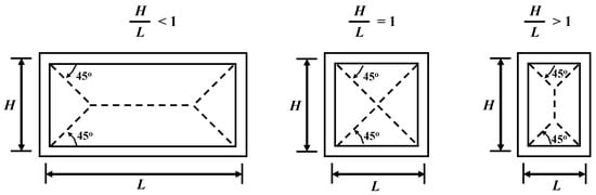 Different analytical methods have been developed to determine the out-of-plane strength of masonry walls, such as the compressive strut method [10,16], yield line method [9,16,25], and failure line method [16,25]. In addition, different numerical models have been developed to calculate the out-of-plane strength of masonry walls, such as the spring-strut method [16], bidirectional strut method [26], two-dimensional fictitious truss [23], finite element method [27,28,29], discrete element method [30,31], and lattice discrete particle model [32], among others. The analytical and numerical methods mentioned have different levels of complexity and computational cost, and their accuracy in predicting the out-of-plane strength of walls varies depending on the type of masonry wall. In particular, the out-of-plane strength of confined walls is best predicted with the bidirectional strut method [26]. This method has a low computational cost and is summarized later in this paper. In the bidirectional strut method, failure of the unreinforced panel is considered. However, the out-of-plane strength of walls can be also limited by the local failure of concrete confining elements [20], for example, flexural, shear, and torsional failure of those elements.