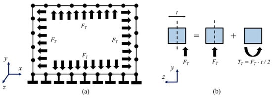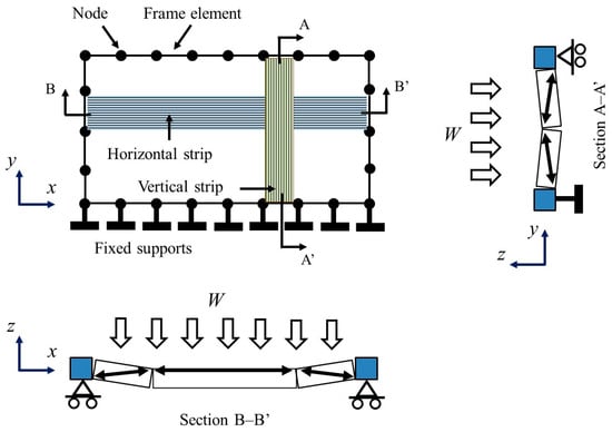The out-of-plane strength of confined walls was calculated with a computer program, developed in this work. This program was based on the bidirectional strut method [26]. Details of this method are presented in [44]. In this method, only failure of the wall panel is considered, for example, crushing of masonry and snap through of wall segments. The bidirectional strut method is briefly summarized as follows. An idealized wall cracking pattern is assumed based on the wall aspect ratio (Figure 4). The wall is divided into wall segments. The wall is additionally subdivided into vertical and horizontal strips (Figure 5). Compressive strut forces associated with an arching action mechanism are developed in each strip. The in-plane components of the compressive strut forces (in-plane forces, ) are applied eccentrically to the frame of confining elements (Figure 6). These confining elements are modeled using frame elements with lengths equal to the strip widths. The frame elements have six degrees of freedom per node (three translational displacements and three rotational displacements). The nodes at the bottom of the frame are fixed. All out-of-plane translational displacements of the frame are restricted. It is considered that out-of-plane wall translational displacements are applied at the wall center and that the wall segments rotate in rigid body motion. An increment of the out-of-plane wall displacement is applied in each load step. A structural analysis is performed on the frame of confining elements considering eccentric uniform in-plane loads () acting around the frame (Figure 6). In-plane displacements are computed considering the effects associated with rigid body motion and axial deformation of wall segments, as well as torsion of confining elements. The structural analysis and the computation of the in-plane displacements are repeated until the displacement convergence criterion is satisfied. The out-of-plane strength of confined walls is computed considering the out-of-plane equilibrium between the external loads () and the out-of-plane components of the horizontal and vertical compressive strut forces (Figure 5). The input of the computer program includes the compressive strength of masonry over the net area, wall height, wall length, wall thickness, wall axial load, width, depth, modulus of elasticity, and shear modulus of the confining elements. The output of the computer program for each wall is the out-of-plane strength that is calculated as the sum of the contributions of the compressive struts in the vertical strips, horizontal strips, and the wall axial load, as well as the type of failure and the in-plane loads.