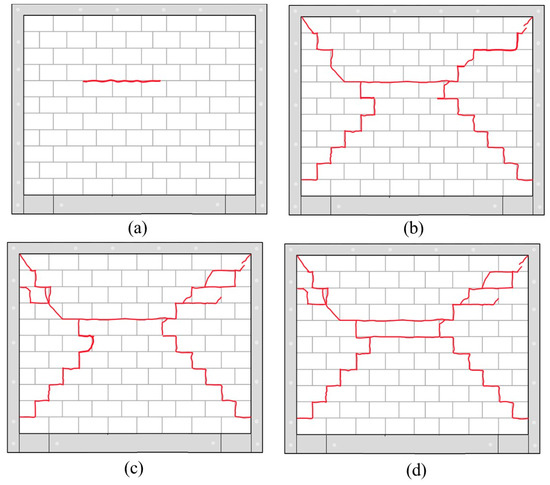 Crack propagation of wall M1: (a) first crack; (b) diagonal cracks; (c) additional cracks; and (d) final cracking pattern.