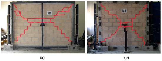 Final cracking patterns of walls: (a) M1; and (b) M2.