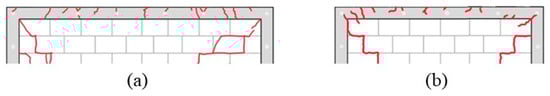 Final cracking patterns of top horizontal confining element of walls: (a) M1; and (b) M2.