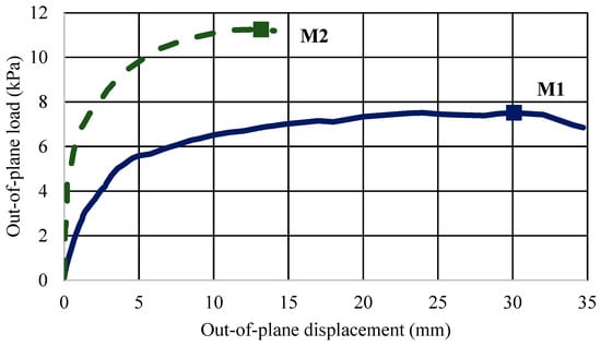 Out-of-plane load—displacement curves of walls M1 and M2.