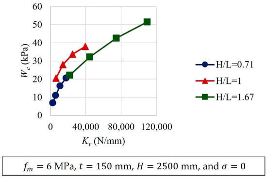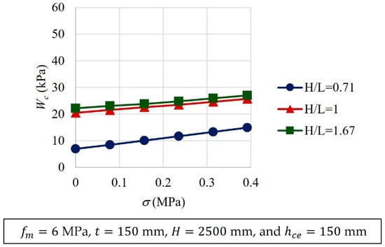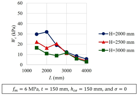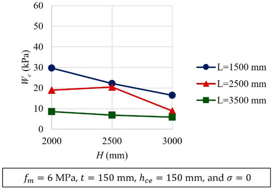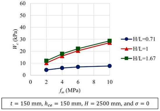 Typical results of the parametric analyses are presented in Figure 11, Figure 12, Figure 13, Figure 14, Figure 15, Figure 16 and Figure 17. Variables that were kept constant in the analyses are included in the corresponding figures. It was observed that as , , , and increased, increased (Figure 11, Figure 12, Figure 15, Figure 16 and Figure 17). On the contrary, as and increased, decreased (Figure 13 and Figure 14). A relative increase in the out-of-plane strength was observed for walls with an aspect ratio of one (Figure 13). This increment was associated with the change in the idealized cracking pattern used for this aspect ratio (Figure 4). The increment showed the need to use at least two wall aspect ratio intervals for the design equations. In addition, it was observed that, as increased, increased. For walls with the same height, as the wall length decreases, the aspect ratio increases. Walls with small lengths have larger stiffness , and therefore larger out-of-plane strengths (Figure 15). In addition, it was observed that the parameters related to the geometry of the wall panel (, and ) are those that have the greatest influence on the out-of-plane strength of confined masonry walls. The out-of-plane strength of walls is determined by the out-of-plane component of the compressive strut forces that are in the wall segments. This component is a function of the wall geometry. Out-of-plane component of compressive strut forces increases as the wall thickness increases or the wall height or length decreases.