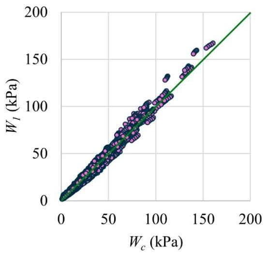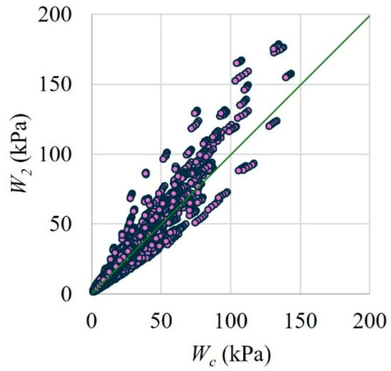The metrics of the multiple linear regression analysis carried out for , , and (Equations (4)–(6)) are presented in Table 6. Similarly, corresponding metrics for , , and (Equations (15)–(20)) are presented in Table 7. It is observed in these tables that a high accuracy was obtained for all the equations. The design out-of-plane strengths ( and ) are compared with corresponding computational out-of-plane strengths () for the 6912 walls (Figure 18 and Figure 19). and were calculated with Equations (3) and (14), respectively, substituting the input information of each wall that was analyzed with the computer program. Figure 18 and Figure 19 have a green reference line to identify cases in which was similar to and , respectively. The average ratio of was equal to 1.00 with a coefficient of variation (CV) of 0.11. The average ratio of was equal to 1.04 with a CV of 0.21. As expected, the out-of-plane strength is better predicted with the first design equation. In this equation, the interaction between the properties of the wall panel and the stiffness of the confining elements were considered by the coupling between variables, for example, coupling between , , , and , with in Equation (4). In addition, in the first design equation, the stiffness of the confining elements was calculated considering flexural and torsional effects. On the other hand, the second design equation is a simplified version of the first one, is easier to use in engineering practice, and predicts well the computational out-of-plane strength.