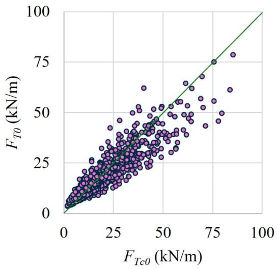 The metrics of the multiple linear regression analysis carried out for (Equations (22) and (23)) are presented in Table 10. It can be observed in this table that a high accuracy was obtained with both equations for . The design () and computational () in-plane forces for walls without axial load are compared in Figure 20. was calculated with Equations (22) and (23), substituting the geometry of each wall that was analyzed with the computer program together with and . Figure 20 has a green reference line to identify cases in which was similar to . The average ratio between was 1.00 with a CV of 0.26. In addition, the ratio between and is compared for walls with axial load in Figure 21. The average ratio of []/[] was 1.00 with a CV of 0.06. It was observed that the computational in-plane forces are well predicted with the design equation. In addition, it was observed that the ratio between was always equal to or less than one (Figure 21). This means that the presence of the axial load reduces the in-plane forces because they are opposite to each other.