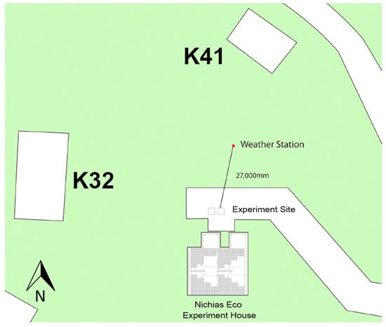 Site plan indicating the locations of the Nichias Eco Experiment House, the test specimens, and the weather station.
