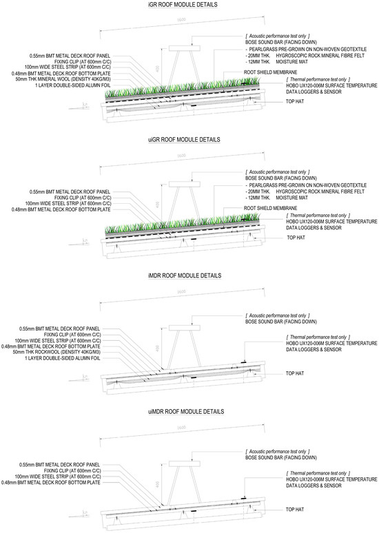Details of iGR, uiGR, iMDR, and uiMDR roof modules for the thermal and acoustic performance tests.