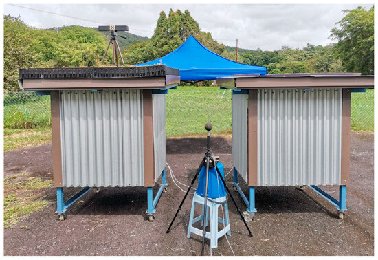 The thermal and acoustic performance of the test modules were investigated via field measurements using small-scale test modules, a method that has been used in past studies [5,6,7,20,45]. As illustrated in Figure 1, the study was conducted within the Nichias Eco Experiment House compound at Universiti Teknologi Malaysia, Skudai, Johor, Malaysia (1°33′51.9″ N 103°37′43.7″ E). The site was located at least 45 m away from any inhabited structures. Climate-wise, Malaysia is a hot and humid tropical country with daily and annual variations in temperature of 5 °C–10 °C and less than 2 °C, respectively [46].