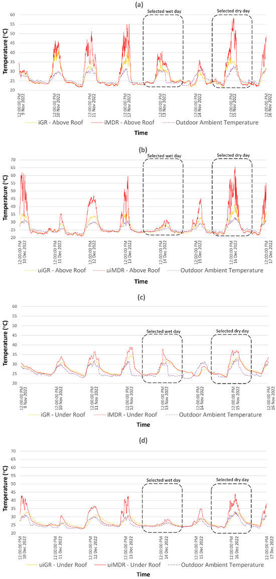 For the uninsulated roof modules test (uiGR and uiMDR), 16 December 2022 was selected for a dry-day scenario analysis for a 24-hour period. 14 December 2022 was selected for a wet-day scenario analysis. Based on data from the weather station, there were two approximate periods of rainfall on 14 December 2022, namely between 5.00 a.m. and 3.30 p.m., then 8.30 p.m. and 9.00 p.m. However, for the temperature assessments of the roof modules, the wet day scenario analysis was conducted on data collected between 5.00 a.m. and 12.00 a.m. to remove pre-pluvial conditions.