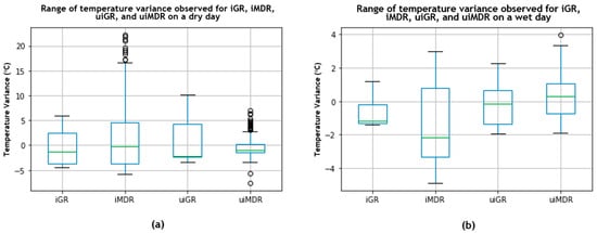 Boxplots indicating the range of temperature variance for iGR, iMDR, uiGR, and uiMDR on (a) a dry day and (b) a wet day.