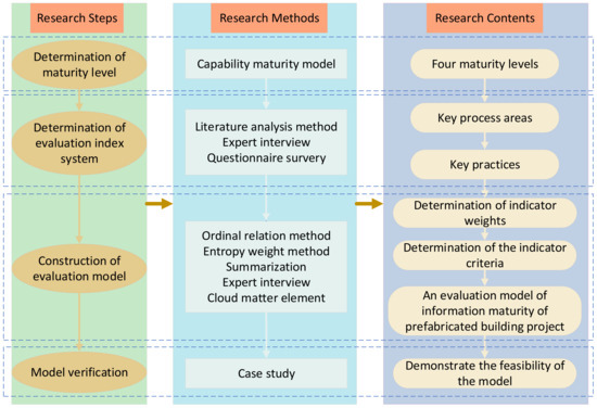 Based on the capability maturity model and the development process, the information technology maturity for assembly-building projects is categorized into four levels. The primary sources of information for key process areas and key practices were obtained from relevant specification texts and the literature on the Web of Science. To validate and revise these key practices, expert interviews and questionnaires were utilized and an indicator evaluation system was constructed based on key process areas and key practices. On this basis, the weights of the indicators are determined through the comprehensive assignment of the ordinal relationship method (G1) and entropy weight method. Subsequently, the development of the evaluation model is grounded in the cloud matter element theory. The feasibility of the model is ultimately verified by an example. The specific research framework is illustrated in Figure 1.