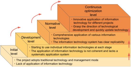 The approach to the classification of maturity levels is subject to variation. Typically, these levels are categorized into four to six levels based on a detailed description of the developmental process [33]. The maturity of the informatization of an assembly building project reflects its level of information and technology application. Due to the implementation of conventional management and technical methods, earlier projects had limited application of informatization. Information technology is implemented in the construction industry to improve efficiency, as it industrializes and transitions to information technology. In order to solve the issues of resource waste and environmental pollution, the project gradually adopts a greater amount of information technology to form a technical system. With the rapid development of technology, information technology must be constantly updated to secure sustainable development. Utilizing the concept of the division of capability maturity model, the sequential and in-depth development of informatization in assembly-building projects can be categorized into four levels: initiation, development, normative, and continuous optimization. Figure 2 characterized each maturity level as follows.