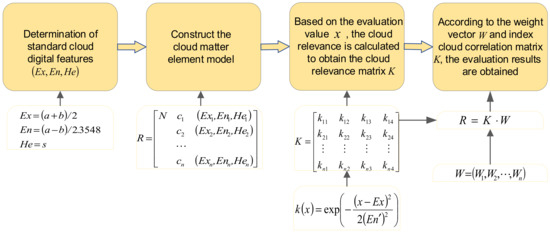 An evaluation method, known as the cloud matter element theory, integrates cloud modeling with conventional matter element analysis. The essence of this method is to substitute the numerical values assigned to items in the original matter element analysis with the cloud model digital feature expectation (), entropy (), and super entropy (). Then, a comprehensive evaluation of those items is conducted by repurposing the concept of the conventional object meta-analysis. One advantage of employing this method is that it permits the mapping of indicator value uncertainty via the ambiguity present in the cloud model [68]. The formulas and specific steps are illustrated in Figure 4. The upper and lower limits of the standardized interval for the evaluation of the indicators are denoted by a and b, respectively. The value of the constant may be adjusted in accordance with the level of ambiguity during the grading process. represents a normal random number generated with being the expected value and being the standard deviation. The assessment value of the indicator was determined by averaging the scores of the experts listed in Table 3 on a scale of 0–100.