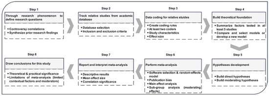 Drawing upon prior meta-analysis studies [15,46,47,51], the authors devised an eight-stage methodology, as depicted in Figure 1. These steps include (1) refining research questions, (2) identifying relevant studies from academic databases, (3) coding the selected studies, (4) constructing a conceptual model based on the most frequently tested factors, (5) formulating hypotheses, (6) executing the meta-analysis, (7) reporting and interpreting the results of the meta-analysis and moderator analysis, and (8) signifying the research significance and addressing methodological limitations. The detailed selection process will be expounded upon in Section 4.
