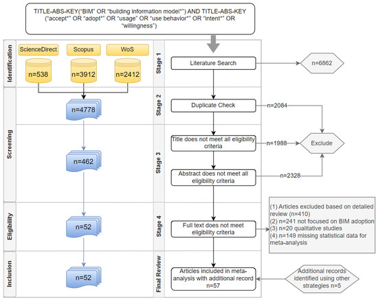 The study selection process adheres to the Preferred Reporting Items for Systematic Reviews and Meta-Analysis (PRISMA) guidelines, which are illustrated in Figure 3. The comprehensive search across all potential databases generated a total of 6862 records. After eliminating duplicates, 4778 unique records remained. The titles and abstracts of these records were screened to ensure that they met the primary criterion of focusing on BIM adoption. At this stage, 4316 records were deemed ineligible and excluded. The full text of the remaining 462 records was meticulously assessed using four inclusion criteria. Firstly, studies were required to empirically investigate the behavioral intention of construction practitioners toward BIM acceptance, with other contexts, such as BIM learning behavioral for students, being excluded (e.g., [71]). Secondly, only studies that investigated at least one bivariate relationship between the antecedents and consequences of BIM adoption, predominantly focusing on UTAUT constructs or related variables, were eligible for inclusion in the meta-analysis. Thirdly, the studies were required to report sample size and statistical information, which could be utilized to calculate the effect size. Lastly, the studies were restricted to peer-reviewed scientific articles that were written in English.