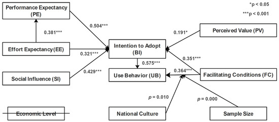 In recent years, some studies have explored the determinants of Building Information Modeling (BIM) adoption. However, the findings of these studies are varied and sometimes contradicting. Consequently, this study undertakes an in-depth exploration of the relationship between influencing factors and behavioral intention. This analysis is achieved through a synthesis of findings from prior empirical studies, considering the nuanced impacts of specific contextual factors, including sample size, national culture, and economic level, on these relationships. In total, this meta-analysis encompasses 57 articles, and as of 31 December 2023, incorporates 63 datasets comprising a collective sample size of 13,301. An extended Unified Theory of Acceptance and Use of Technology (UTAUT) model was developed based on the most frequently studied constructs relevant to BIM adoption. The analysis reveals that BIM adoption is primarily affected by performance expectancy, social influence, facilitating conditions, effort expectancy, and perceived value. The moderator analysis indicates that sample size statistically significantly moderates the relationships between facilitating conditions and use behavior. Moreover, the extent of individualism in each national culture significantly moderates the associations between facilitating conditions and user behavior. The research serves to enrich the existing body of literature on BIM acceptance by addressing contradictory and mixed results found in empirical studies. It represents one of the first attempts to explore the influence of sample size, economic level, and Hofstede’s six cultural dimensions as moderators in the field of BIM utilizing meta-analytic techniques.