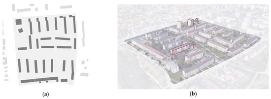 The analysis site is located within a residential settlement in northern Munich, Germany. The settlement has a ground area of 300 × 340 m, and its urban geometry consists of linear buildings with a building height of four stories. Two nine-story high-rise buildings complete the building structure (see Figure 2). The neighborhood represents a typical German post-war residential settlement, classified as Urban Structural Type 3 according to []. This settlement type is the most recurrent one in Germany [], and the building density of 19% and the extensive areas between the buildings provide large solar potentials for applying photovoltaics to the building surfaces.