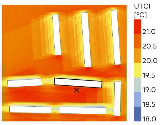 Figure 4 shows a comfort map of the analyzed district without photovoltaic installations, expressed using the Universal Thermal Climate Index (values weekly averaged for the hottest week (19–25 July)). The areas in front of the east and west façades show lower UTCI values during summertime and provide higher thermal comfort. The open spaces in front of the south façades reach up to 2.0 K higher UTCI values—hence, they are prone to overheating and the provision of thermal discomfort. Thus, further analysis is conducted 0.5 m in front of the south façade to analyze the most critical areas within the district, as shown in Figure 4.