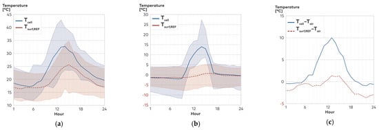 Surface temperature (Tsurf,REF), visualized in red, and cell temperature (Tcell), visualized in blue, at a height of 1.6 m, weekly averaged, and minimum/maximum values. (a) For the hottest week (19–25 July); (b) for the coldest week (13–19 December); (c) temperature differences between cell temperature (Tcell) and ambient air temperature (Tair) and surface temperature (Tsurf,REF) and ambient air temperature (Tair) during the hottest week (19–25 July).