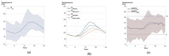 Hourly simulation results weekly averaged for the hottest week (19–25 July) and minimum/maximum values with and without PV installation. (a) Ambient air temperature (Tair); (b) mean radiant temperature (TMRT) with the reference case visualized in red/orange and the PV case visualized in blue/green; (c) Universal Thermal Climate Index (UTCI) with the reference case visualized in red and the PV case visualized in blue.