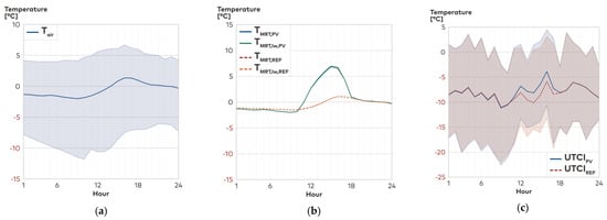 Hourly simulation results weekly averaged for the coldest week (13–19 December) and minimum/maximum values with and without PV installation. (a) Ambient air temperature (Tair); (b) mean radiant temperature (TMRT); (c) Universal Thermal Climate Index (UTCI) with the reference case visualized in red and the PV case visualized in blue.