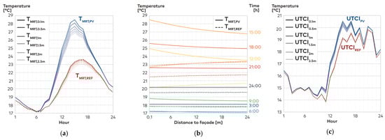 Figure 8a shows the hourly mean radiant temperature weekly averaged for the hottest week at different distances from the building façade. During the daytime, with solar irradiation impinging on the façade, the TMRT,PV 0.1 m in front of the PV façade is up to 1.64 K higher (at 2 p.m.) than the TMRT,PV at a distance of 2.5 m from the façade. During night-time, TMRT,PV remains constant, regardless of the distance from the façade. For the conventionally rendered façade, the differences in the TMRT,REF with an increasing distance from the façade are not as pronounced. During the daytime, TMRT,REF even increases with a larger distance from the façade by up to +0.56 K at noon (see Figure 8b). Still, even 2.5 m from the building, the mean radiant temperature in front of the PV façade is up to +3.72 K (at 2 p.m.) higher compared to the TMRT in front of the conventional façade.