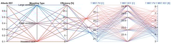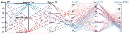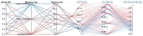 The subsequent parameter study helps identify the parameters to which the analysis metrics are sensitive (see Section 2.2). The following parameters are investigated: The albedo of the reference façade, the photovoltaic efficiency, and the photovoltaic mounting situation (see Table 4). The analysis period is the hottest week (19–25 July), and the simulation results are weekly averaged and analyzed at noon. The analysis is graphically displayed using the Design Explorer tool [].