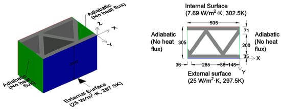 In this heat transfer investigation, two parallel surfaces were identified as isothermal with varying temperatures. As a result, a perpendicular heat flow between these surfaces was established while disregarding any heat flux in the other direction since the other boundaries are considered insulated (adiabatic). The convective surface heat-transfer coefficients for the external and internal environments were set according to the provisions of EN ISO 6946: 25 W/m2.K and 7.69 W/m2.K, respectively []. The exterior and interior sink temperatures were determined to be 302.5 K and 297.5 K, respectively. To achieve a design temperature difference of 5 K, the ambient temperature was maintained at a constant 295.15 K. Surface average weighted heat flux results were derived from simulations, and U-values were calculated by dividing the surface average weighted heat flux with the design temperature difference. The empty cavities were modeled as air layers. The thermal conductivity of still air was determined by dividing the thickness of the air layer with unventilated air layer thermal transmittance values interpolated from the relevant table given in EN ISO 6946 []. Figure 1 shows the application of boundary conditions to the FE models.