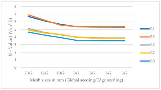 Mesh sensitivity analysis was performed to find the ideal element size that produces the more accurate results while consuming the least amount of computational time and resources. To do so, seven various mesh size combinations of global and edge seedings were investigated in five cavity layouts of hollow concrete bricks selected from the work of Henrique dos Santos et al. []. They thermally characterized several cavity layouts of hollow concrete bricks. The cavity layouts selected for sensitivity analysis were B1, B3, B5, B7, and B9, and are provided in Figure 2. Edge seeding was used to selectively refine the mesh along edges or boundaries where higher mesh resolution is needed to improve the overall mesh quality. This sensitivity analysis’s global/edge seeding combinations ranged from a very coarse combination of 20/2 mm to a finer 3/2 mm. Figure 3 depicts the mesh sensitivity analysis.