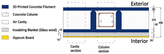 The constitutive model used was also validated against the work of Tamimi et al. []. They studied the thermal performance of 3DPC walls both experimentally and numerically. They established the thermal transmittance values of the printed structures using heat flux meters and thermocouples. Figure 5 shows the wall geometry of Structure 1 adopted for validation.