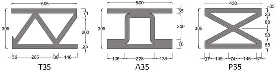Wall types (35 mm filament width) for the parametric analysis (dimensions in mm).