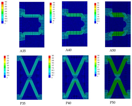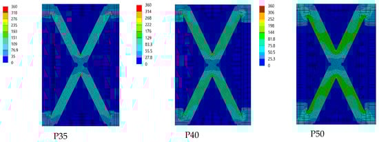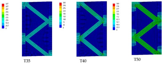 Figure 7 shows the heat flow paths in the surface heat flux contour maps of the walls. In T and A walls, heat transfer occurs predominately through voids via gas conduction (vibration and collision of gas particles). This is because the total thermal conduction of the stagnant air volume considered is slightly higher than that of the 3DPC in both wall types. It should be noted that the thermal conductivity of stagnant air is proportional to the thickness of the air layer []. Thus, gas conduction is high in thick air layers. T35 has the highest U-value, 3.486 W/m2.K, of all walls, indicating the poorest thermal performance (Table 3). P50 shows the best thermal performance under stagnant air conditions, with a U-value of 1.947 W/m2.K. Furthermore, it is observed that for T and A walls of the same filament width (nozzle size), the U-values of the T walls are slightly higher than those of the A walls. For example, T40 has a U-value of 3.312 W/m2.K while that of A40 is 3.296 W/m2.K. The thermal behavior may be because of the difference in void areas. Additionally, a notable decrease in the U-values is seen across all wall types with an increase in filament width (nozzle size). This may be because of the increase in concrete areas and subsequent decrease in void percentage. Since most of the heat transfer occurs via the more conductive voids, an increase in filament width more or less acts as an insulative reverse effect.